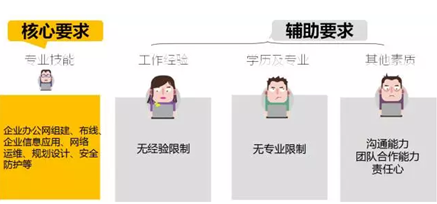 可以看出,企業(yè)對于網(wǎng)絡(luò)工程師的工作經(jīng)驗和學(xué)歷、專業(yè)要求非常寬松,可以說是基本沒有要求,只要你的技術(shù)能力過硬,個人素質(zhì)良好,那么你就能成為網(wǎng)絡(luò)工程師,而且未來職業(yè)發(fā)展提升也會非常迅速!